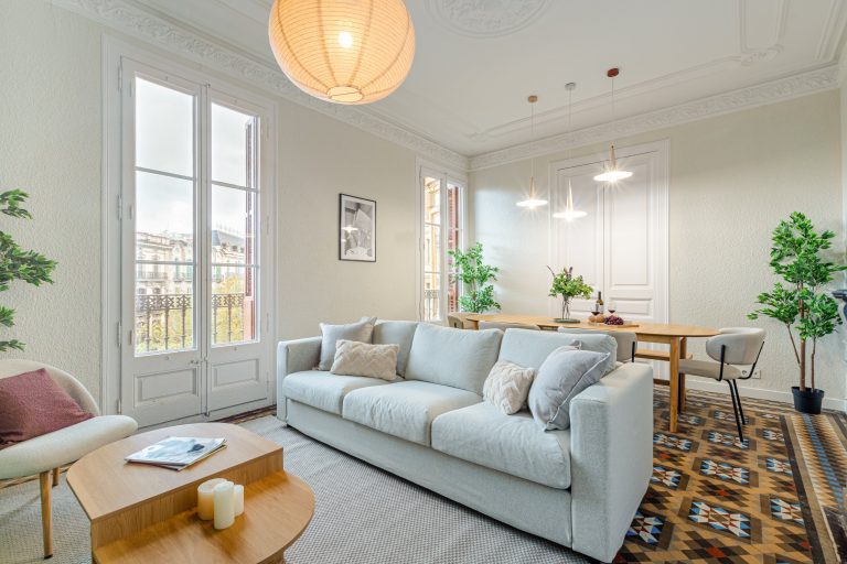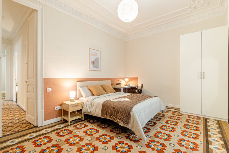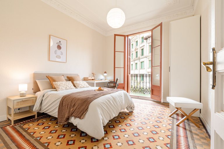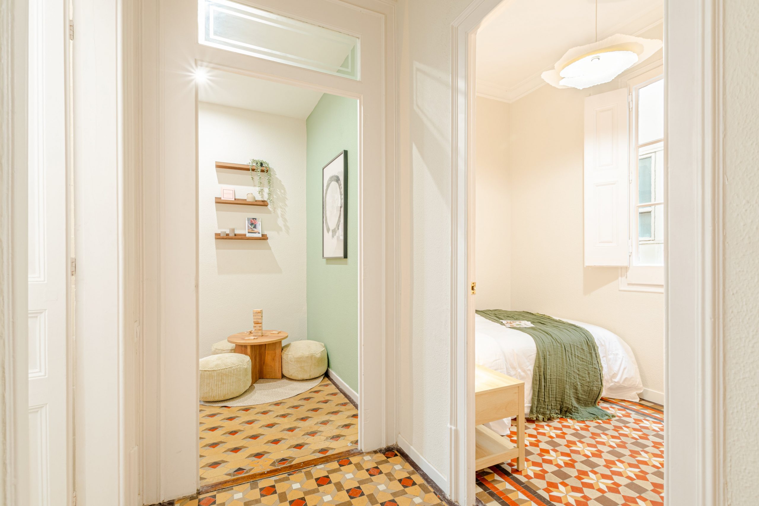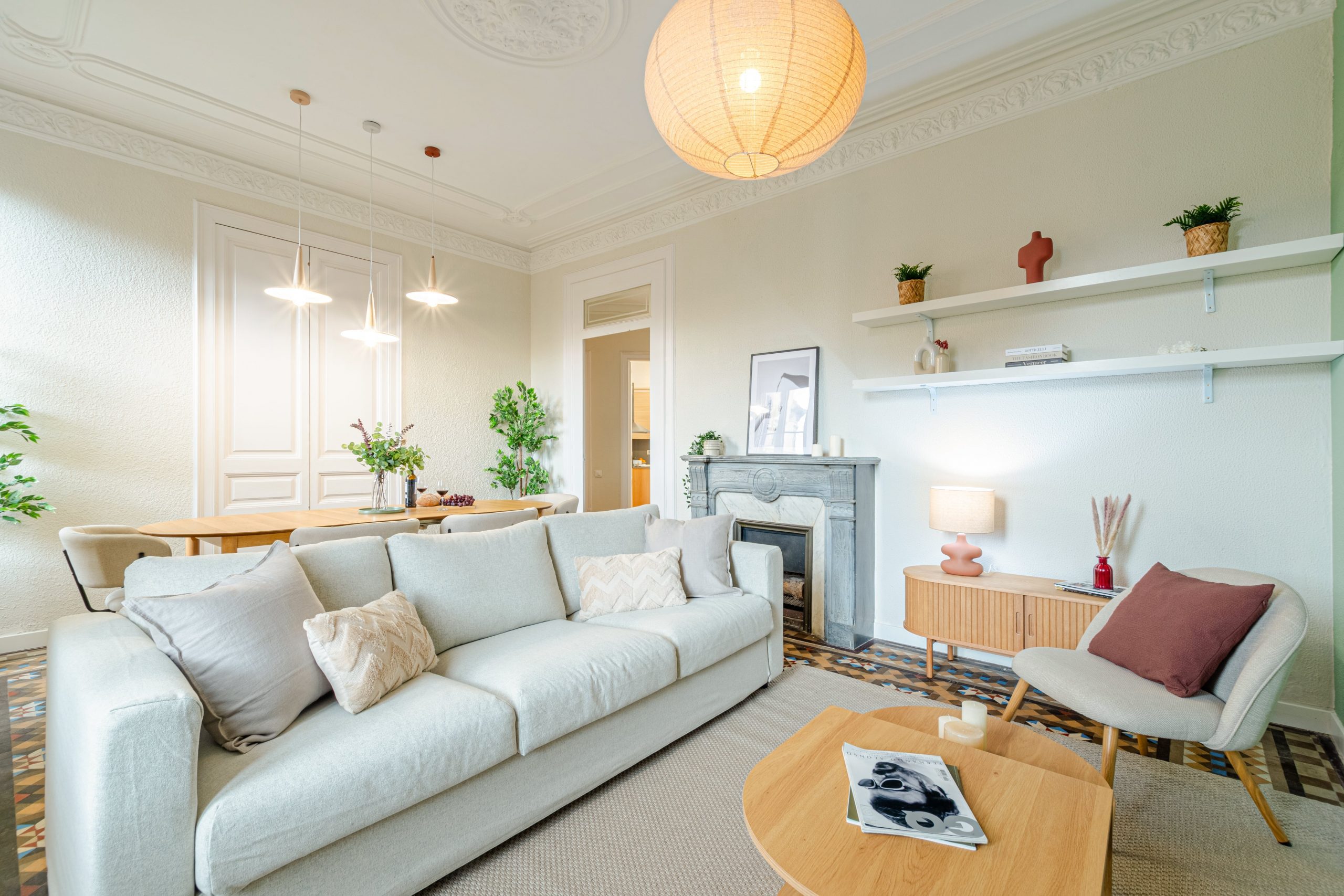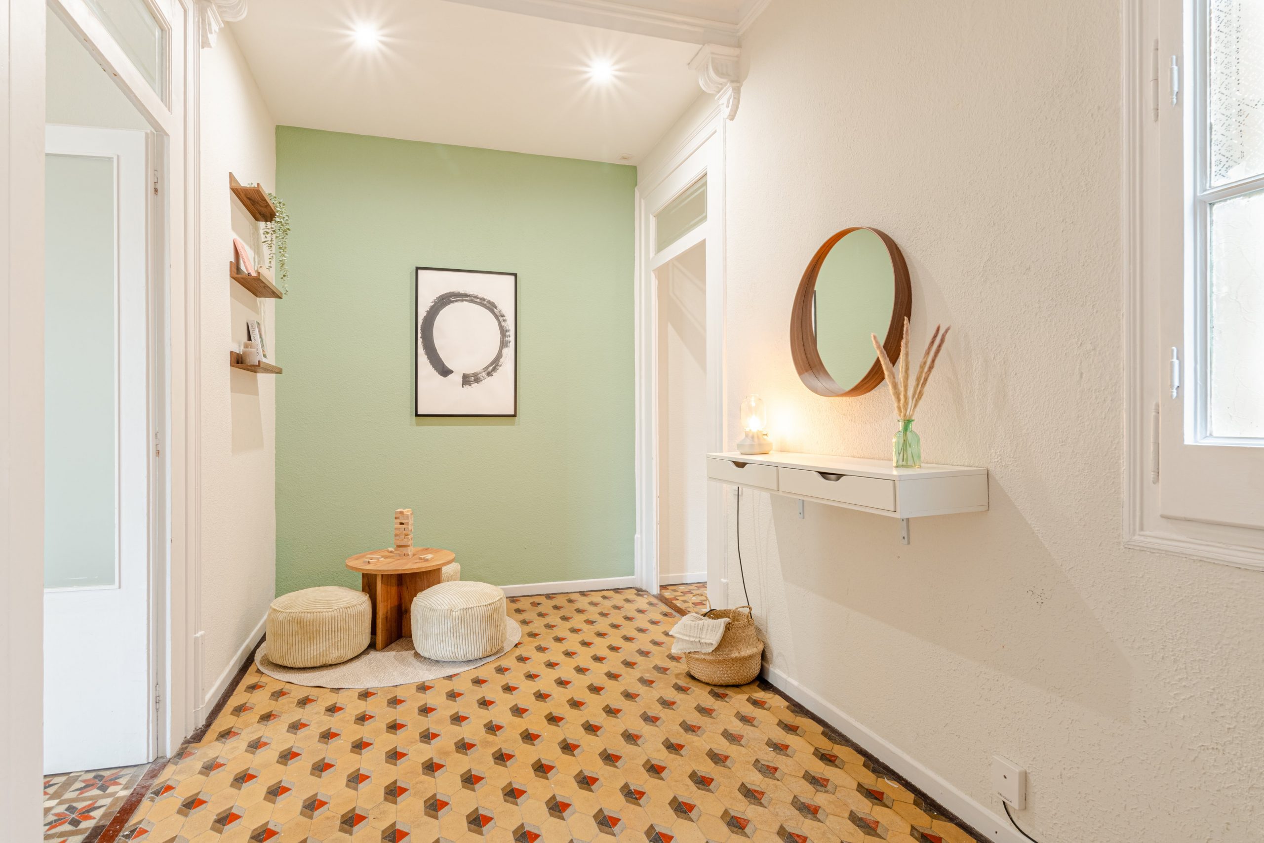 Un espacio que fusiona el encanto del estilo modernista barcelonés, con sus icónicos suelos hidráulicos y elegantes molduras, con una estética contemporánea y toques de color que aportan frescura y vitalidad. El resultado: un piso con carácter, funcionalidad y un ambiente joven, listo para ser compartido.