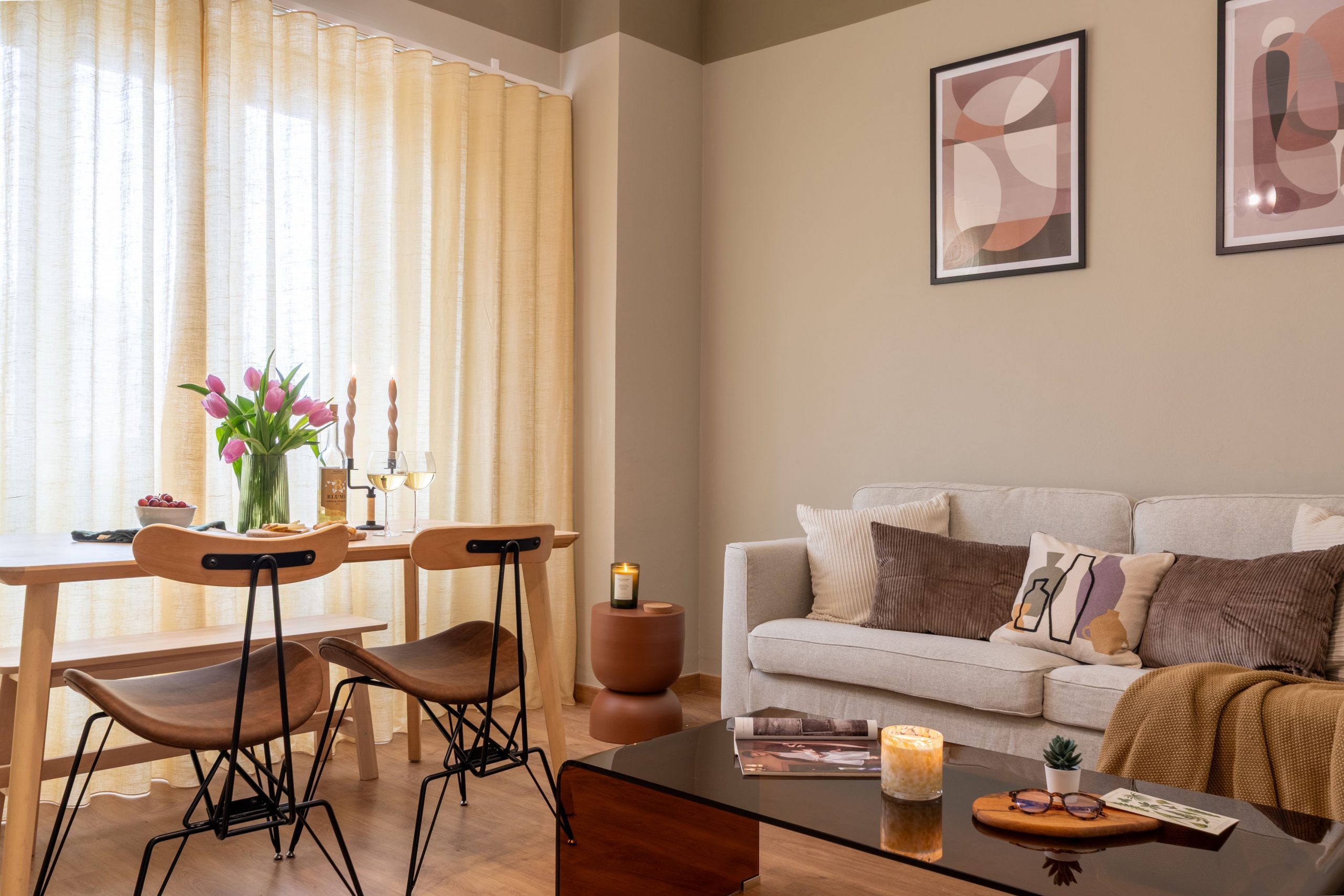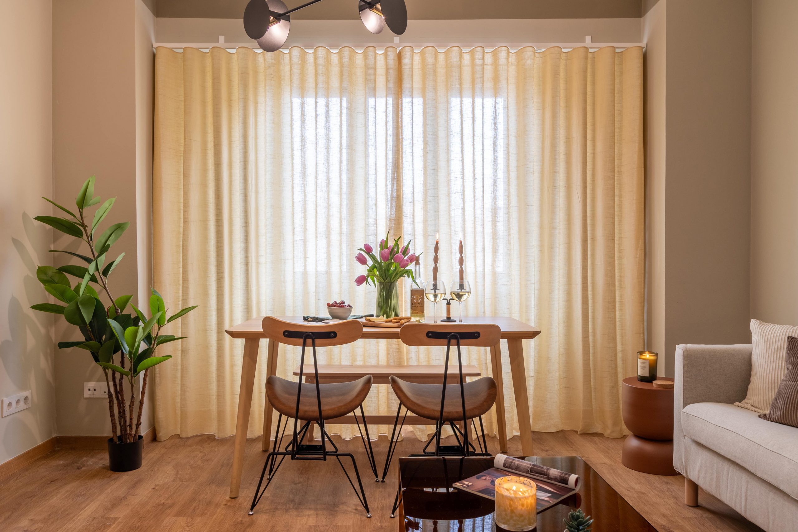 En este proyecto se ha conseguido un ambiente muy cálido y acogedor, gracias al uso de maderas, tonos neutros y terrosos, combinados con detalles en verde que aportan frescura y vitalidad de forma equilibrada. Los elementos en cristal y metal, junto con las cortinas amarillas, suman un aire vintage que llena el espacio de personalidad sin perder la armonía.